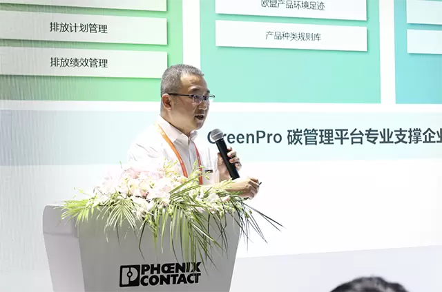 菲尼克斯电气物联网智能服务部经理付岗介绍了GreenPro平台如何赋能企业低碳可持续发展,菲尼克斯电气以Proficloud数智化工业平台为底座,打造了面向企业的一站式低碳管理平台“GreenPro”。该平台支持组织碳盘查、产品碳足迹管理、供应链碳管理等功能,能够帮助企业制定和实施绿色低碳发展战略,有效控制和减少碳排放。通过GreenPro平台,企业可以获得详尽的碳足迹报告与认证服务,从而提升行业竞争力,体现企业的社会责任,缓解生产制造中的碳焦虑。
