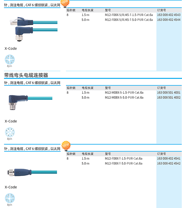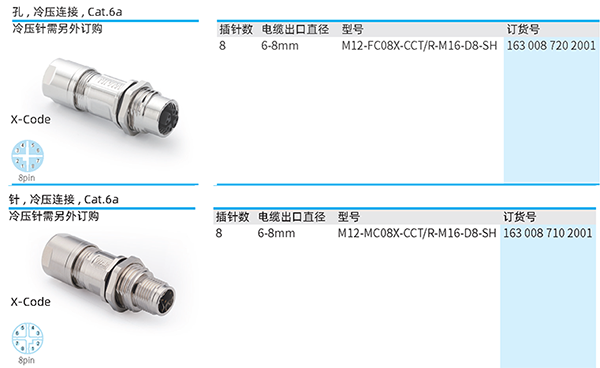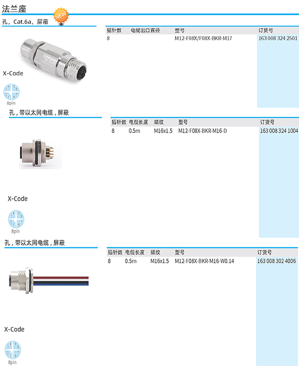 ★其中M12-F08X/F08X-BKR-M17为转换连接器,可实现M12 Xcode接头的转换。