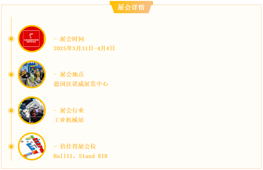 本次展会时间为2025年3月31日至4月4日,展会地点于德国汉诺威展览中心,倍仕得展位号:Hall11,Stand E10,我们期待与您共同探讨工业领域的技术与革新!