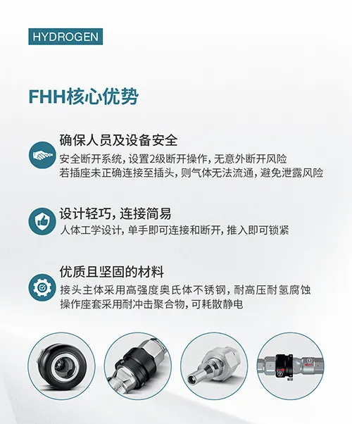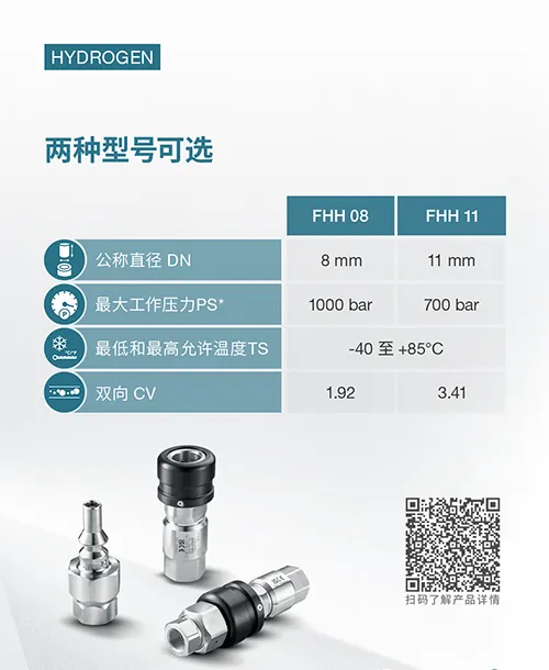 氢能源作为可替代石化燃料的环保清洁能源,正日益广泛应用于各领域。史陶比尔全新推出FHH系列高压快速接头,适用于氢气转运、取样、气密性测试等应用,助力提升生产效率,优化运营成本,推动氢能源普及。