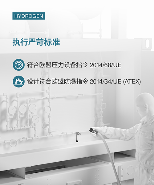 氢能行业必须满足严苛的安全要求,FHH 快速接头严格符合欧盟压力设备指令2014/68/UE和欧盟防爆指令 2014/34/UE (ATEX)。