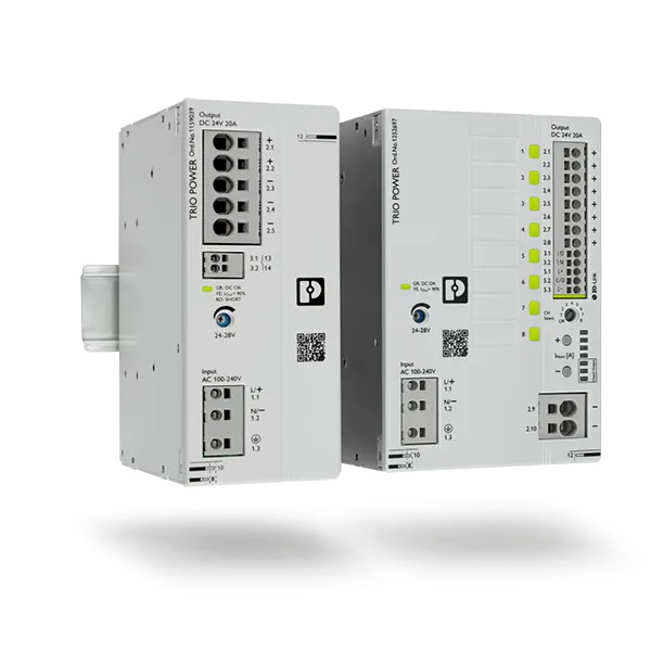 ● TRIO3系列电源集成断路器实现供电保护一体化,配合1000系列超薄交换机(厚度仅 22.5mm),为高密度控制柜提供极致空间解决方案。
