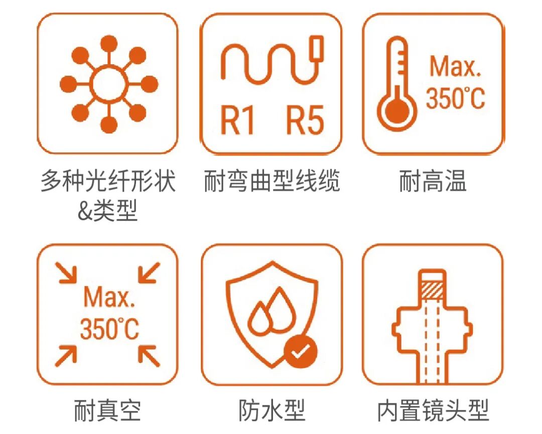 - 标准型,耐热型,耐真空型,耐断型,耐弯曲型,防水型,内置镜头型单位特质支持