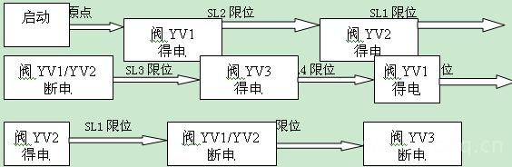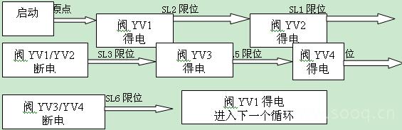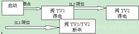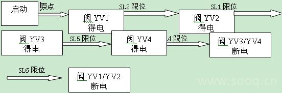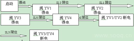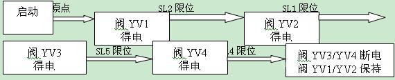 (3)单步工艺流程3描述:开车启动,恢复原点,阀YV1得电,下托板前进碰到下托板慢进限位SL2后阀YV2得电下托板开始慢进,下托板慢进碰到前进到位限位SL1后阀上托板前进阀YV3得电上托板前进,上托板前进碰到上托板慢进SL5限位后,上托板慢进阀YV4得电,上托板慢前进碰到前进到位限位SL4后阀YV1,YV2断电下托板回退,碰到回退到位限位SL3信号后上托板前进阀YV3,YV4断电,上托板回位。