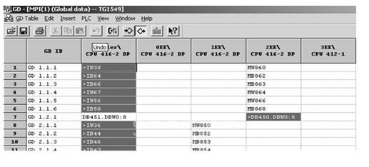 在项目的实施中由于传动PLC之间采用MPI通讯,笔者在第一次项目实施中采用SIEMENS STEP7的程序库自带的程序块进行通讯。但在使用中发现利用程序块的方式并不稳定,每次在硬件配置后都会出现不明原因的中断。由于项目实施周期短,根本没有时间进行原因的查找,故障诊断分析。由于西门子提供了全局变量的通讯方式,并且其硬件方式也是利用MPI网络。笔者抛弃第一种方案,最终采用全局变量进行传动PLC间的通讯。事实证明这种方案简单易行且相当可靠。全局变量的通讯方式更多依赖于硬件配置,不需单独编程,对于通讯的变量可直接引用,并且全局变量的硬件配置的下载可以在线进行,PLC不需重启。