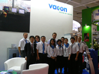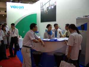 Vacon的展台简洁明亮,仍以一贯的主色调示人,白色的沙发使人感觉亲切、随和,这也正如Vacon员工的对工作所持的态度一样。Vacon在此次展会站上展出的所有产品都是在Vacon的苏州工厂组装生产,包括Vacon NXL系列MF2-6, NXP系列FR7、8、9以及一台NXS 立式单元。至今年年底,Vacon苏州工厂生产的变频器最大功率将达到800kW。
