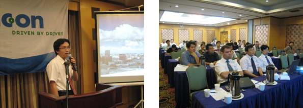 Vacon的领导对于此次技术交流会给予了充分的重视,中国市场及销售总监张登山先生出了席会议,并在会上作了重要发言,并借此机会向客户介绍了Vacon集团全球以及在中国市场上的销售及发展情况。随后,由来自Vacon芬兰总公司的技术工程师Markus Forma先生对Vacon变频器主要产品类型及其产品特性作了详细介绍,使客户近一步了解Vacon的产品。之后,负责北方区销售的区域经理刘志宏先生对Vacon变频器在热电行业的应用进行了介绍,结合实际应用情况,进一步加深客户对Vacon变频器的了解。