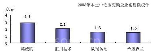 从内资品牌(不包括台湾品牌)看,我国中低压变频器行业的集中度不高。以2008年所占市场份额为主,综合考虑其它因素,例如发展速度、业内口碑等,内资品牌可以分为3个档次。从2008年的销售额看,第一集团内单个企业销售额均不低于1.5亿元。第二集团内单个企业的销售额在5千万至1.2亿元不等。由于该集团内的企业数量相对较多,本次调研仅统计其中部分企业2008年的销售额。“其它”内资企业数量众多,单个企业的销售额均低于5千万元。以上所指销售额均包含增值税。另外,对同时经营非变频器业务的企业,只统计了其变频器业务的销售额(如前所述,这里统计各企业的变频器销售数据,不包括包含在成套设备中出售的变频器产品)。