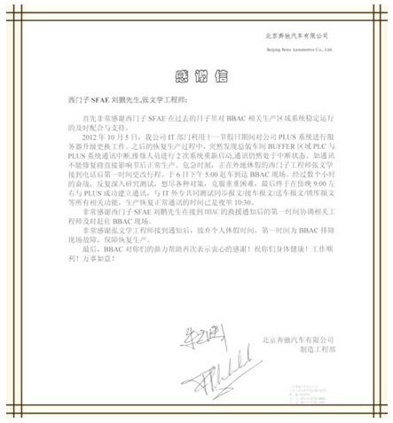 2012年10月12号,SFAE工程部收到了一封来自北京奔驰的感谢信。信中对我工程师给予了高度评价,赞誉他们舍己为工、爱岗敬业、尽职尽责的高尚品质。