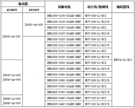 (三)JD630/640伺服驱动器与SMH130/150/180电机型号及配置表