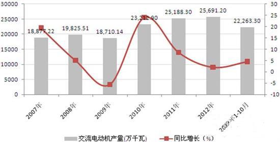 前瞻产业研究院发布的《2014-2018年中国电动机制造行业产销需求预测与转型升级分析报告》数据显示,近年来,我国交流电动机的产量呈现波动变化趋势,2011年我国交流电动机的产量为25188.30万千瓦,同比增长8.51%,到2012年产量增加至25691.20万千瓦,同比1.20%。2013年1-10月,我国交流电动机的产量为22263.30万千瓦,同比增长4.5%。