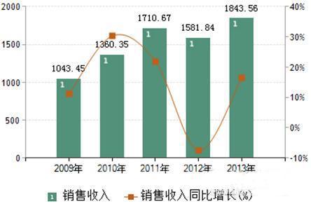 图表2:2009-2013年我国电动机制造行业销售收入及增长情况(单位:亿元,%)