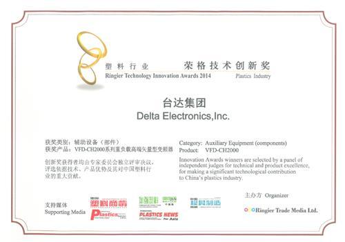 台达自动化近年来强化在重点行业的发展,特别针对高能耗、高污染行业如橡塑、纺机等,推出一系列非常适合国内用户的行业专机,这一策略已初见成效,旗下VFD-CH2000系列重负载高端矢量型变频器继在橡塑行业取得重大突破,并在2014年“塑料行业—荣格技术创新奖”的数百个参评产品中脱颖而出,凭借其大启动转矩、高过载能力、高耐受力、适合塑料行业应用等卓越性能,经过橡塑行业协会、科研院校的资深专家评委团的严格评选后,获选“技术创新奖”,以表彰CH2000引领技术创新服务行业用户的不俗表现。