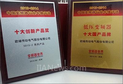 同期,因欧瑞传动产品的创新技术及市场的良好反馈,SD10-Z系列注塑机专用伺服系统获得了“行业十大创新产品奖”。