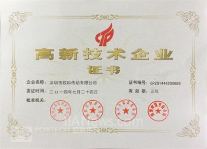 此次顺利通过国家高新技术企业认定,充分体现了科技部门对我公司研发能力的肯定!欧科传动将以通过国家高新技术企业认定为契机,进一步加大研发和营销投入,扩大市场份额,提高品牌知名度,为我国的控制与传动,自动化控制产业的发展贡献自己的一份力量。贡献自己的一份力量。