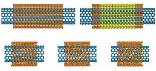 五种模拟的双壁碳纳米管,其中蓝色和橙色分别表示内管和外管参数