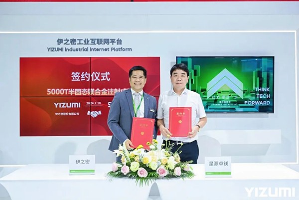 在伊之密(展位号:N1馆A22)活动区,宁波星源卓镁技术股份有限公司(以下简称:星源卓镁)与伊之密签署战略合作协议,订购一台5000T半固态镁合金注射成型机。