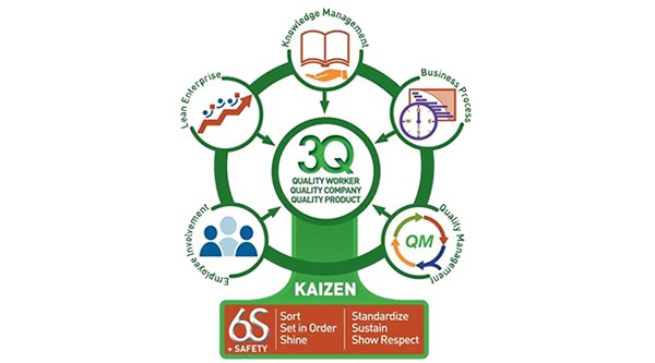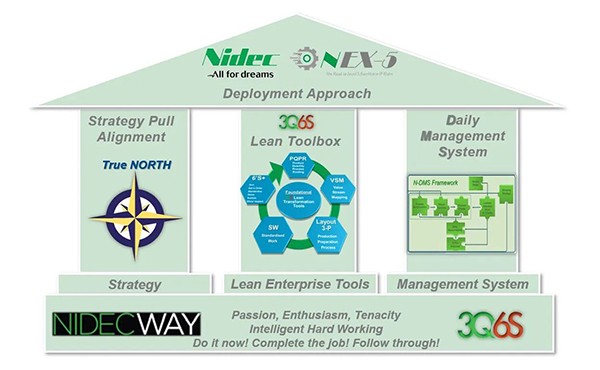3Q6S是尼得科集团经营理念、社宪、质量方针现场展开并得以贯彻的基本要求,它包含好员工(Quality Worker)、好公司(Quality Company)、好产品(Quality Product)以及整理(Seiri)、整顿(Seiton)、清扫(Seiso)、清洁(Seiketsu)、作法(Saho)、教养(Shitsuke)。3Q6S不仅是工作场所的整理、整顿、清扫,它旨在排除一切妨碍工作的障碍,改善工作场所的环境和条件,使得日常工作能够更安全、更好、更快、更省,从而制造出更好的产品,更好地满足用户要求的同时,提高生产效率,确保安全生产。