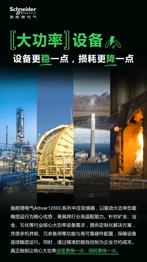 依托高可靠的产品实力与成熟的方案能力,施耐德电气Altivar 1200C系列中压变频器在大功率及超大功率设备应用场景中,可根据不同行业客户的实际需求提供针对性解决方案,助力客户降低投资成本、提升生产效率、保障生产连续性。面对工业4.0与智能制造对设备可靠性、高效率及节能降耗的严苛要求,施耐德电气将持续以创新为核心驱动,一方面通过技术迭代升级变频器的可靠性与数字化运维水平,另一方面凭借不断积累的应用案例强化成熟方案输出能力,赋能工业生产安全高效运行,为全球工业可持续发展注入强劲动能。