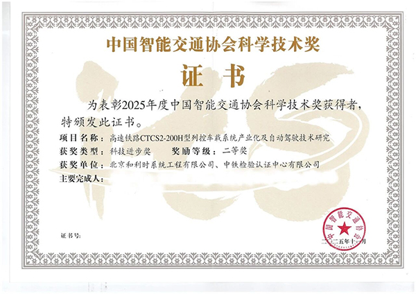 北京和利时系统工程有限公司作为第一完成单位,联合中铁检验认证中心有限公司申报的《高速铁路CTCS2-200H型列控车载系统产业化及自动驾驶技术研究》科技成果荣获“2025年度中国智能交通协会科技进步奖二等奖”。该科技成果项目聚焦我国高速铁路路网应用场景复杂、安全可靠性要求高等难题,通过系统研究与关键技术攻关,取得了一系列创新性成果,目前已成功应用于全路多家单位,经济效益和社会效益显著,推广应用前景广阔。