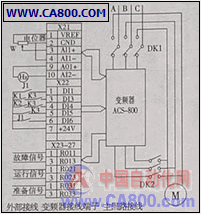 变频器采用ABB公司的ACS-800系列产品,根据汽包水位线的位置,对给水泵电机进行恒速控制,使汽包水位稳定在±30mm范围内,变频器控制系统原理如图1所示。图中J1为启动/停止选择,来自操作回路,J1为0时变频器停止,J1等于1时变频器启动。K1、K2为对应于水位线在±30mm时水位计输出的两对常开点。K3为自动/手动选择开关,K3等于0,选择手动控制方式,使用面板上的电位器手动调节电机转速,使汽包水位稳定在±50mm范围内;K3等于1,选择自动控制方式,利用K1、K2、 K3的逻辑组合控制电机的转速,实现汽包水位的自动调节。K1、K2、K3的逻辑组合与电机转速的对应关系如表1所示。