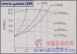 定速节流调整流量时,给水泵的特性曲线如图2中实线所示,uv为电动阀门在不同开度时管道的特性曲线,与曲线n=ne的交汇点为水泵在不同流量下的工作点。从图2中看出,阀门开度从30%变化到100%时,给水泵流量从22t/h变化到40t/h,而给水泵出口压力在5.8~6.5MPa范围内变化很小。