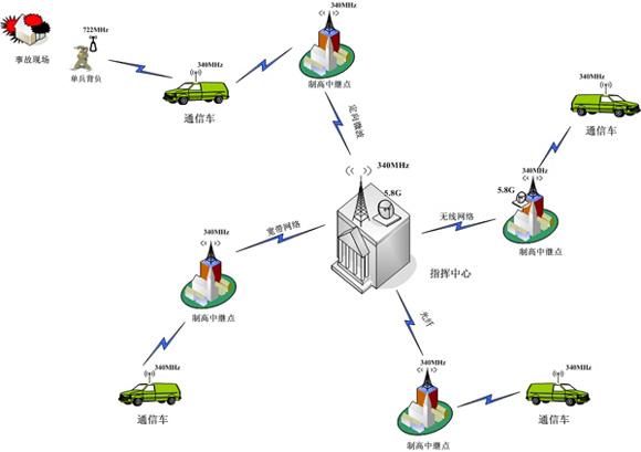 指挥车通过大功率无线移动发射设备将城区四周的制高点,制高点作为系统的信号转发站,制高点通过无线移动接收设备将指挥车上的视音频信号接收后,再通过音视频电缆送到视频编码器转化成网络数字信号,然后信号再通过网络双绞线送入到无线网桥,制高点的无线网桥将全部信号发射到指挥中心,到达指挥中心的MPEG2数字信号即可以转换成模拟信号在大屏幕显示输出,也可以通过网络直接在网络中进行传输,用户经过授权后可通过控制软件在网络上任何一台电脑上进行显示。指挥中心还可通过网络等有线或无线方式将视音频传输到支队相关领导及市政府相关单位。