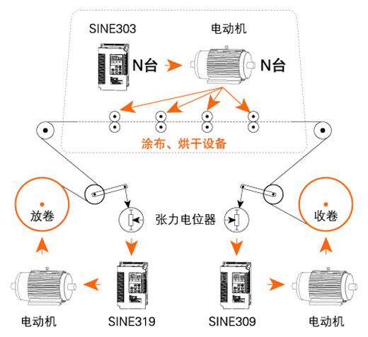 涂布及烘干:SINE303开环矢量控制变频器,四台,比例联动控制,主信号和微调信号按设定比例叠加运行。