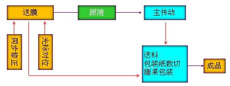 此设备主要实现奶糖的包装,其设备机构及工艺如下图1所示。