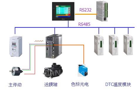 主传动采用变频器控制,主要驱动横封、纵封、切刀、输送,送膜轴采用独立传动控制。 采用DTC温度模块实现纵封和横封的温度控制;送膜轴跟随主轴编码器实现包装纸的送出。并利用色标光电实现色标偏差补偿。如图3所示。
