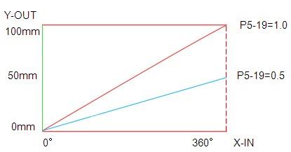 由于上述送纸轴输出为拉膜辊的周长,故对于不同长度的包装纸规格,可以利用凸轮表格缩放比率P5-19进行调整。其原理如下图5所示。