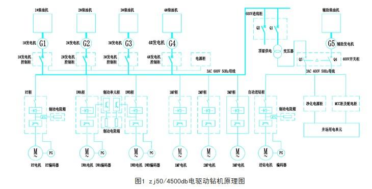 图1为zj50/4500db电驱动钻机原理图[1],动力系统是由4台800kw柴油发电机组并机组成,电能集中输送到交流母线上,钻机转盘由一台交流变频电动机驱动,绞车由2台交流变频电动机共同驱动,每台电机由独立变频器控制,变频器型号为6se7036-5hg62-3ba0、功率为630kw,三台泥浆泵由三台电动机分别驱动,由独立变频器控制,变频器型号为6se7141-2hj62-3ba0、功率为1200kw,送钻电机为45kw,其驱动变频器型号为:6se7090-0xx84-0ab0。
