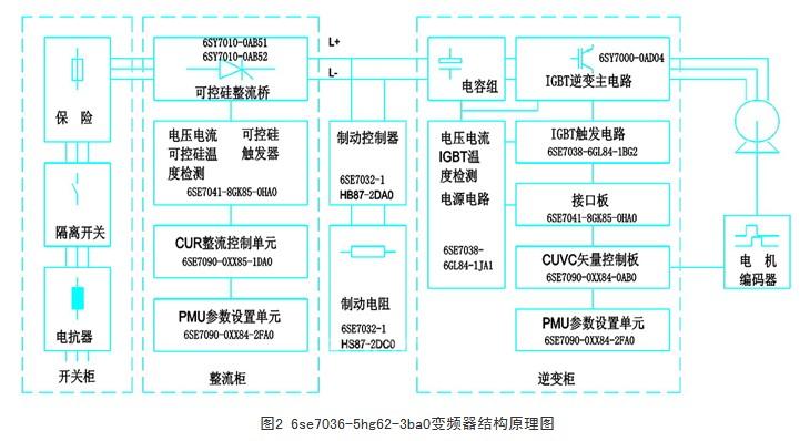 在钻机日常运行中,尽管变频器自身有完善的监测保护功能,但在实际使用中,还是会由于各种原因发生故障,不能正常运转而影响钻井生产。我们在使用维护过程中逐步掌握了变频器的内部结构,根据变频器结构指导维护与维修工作。图2为6se7036-5hg62-3ba0变频器结构原理图。