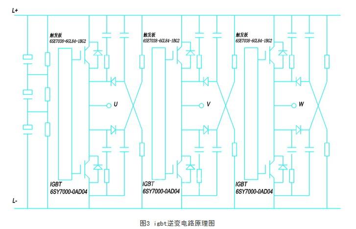 逆变柜内含有igbt逆变桥,图3为原理图,在igbt逆变桥外是电容组,igbt触发板型号为6se7038-6gl84-1bg2,触发板与控制电路之间采用光纤通讯隔离,接口板提供触发光纤接口电路,cuvc矢量控制板是逆变器核心控制板,有参数设置、矢量控制、保护、接口等功能,pmu参数设置单元提供参数显示、设置等功能。
