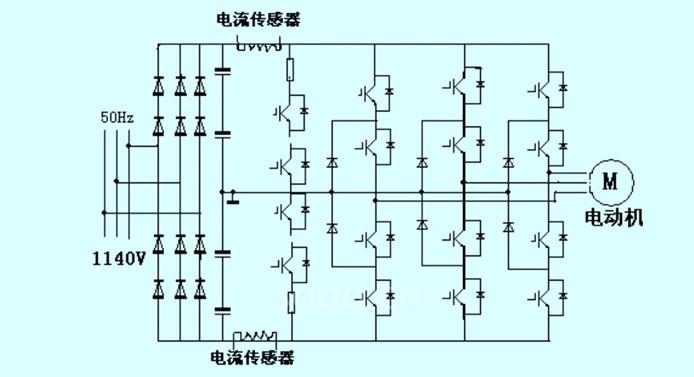 (3)将熔断器更换后,柜子送电正常,工频启动,工作正常,工频维修完毕。接着维修变频部分。其主电路如图1示。