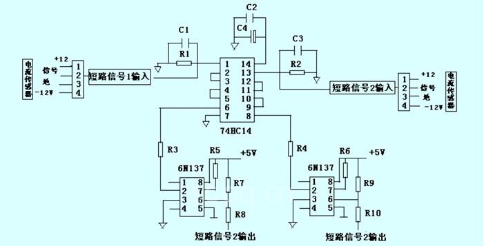 (5)检查短路保护板,如图2所示。将输入端的短路保护取样电流传感器拔下,测量板上的电源电压,±12v正常,但+5v供电电压只有+3.0v,将集成快74hc14拔下,+5v正常,说明该集成块已经损坏,更换一只新的。