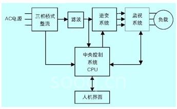 从图1中可以简单理解变频器的工作原理,三相交流电源经桥式整流电路由交流电变为脉动直流电,然后经大容量电容滤波变为较稳定的直流电,再经过振荡逆变系统转换为电压频率可变的交流电去驱动负载电动机,在这过程中有中央控制系统参与的闭环控制,其中包括对输入电源的电压、频率监视、整流后的直流电压监视、输出的电压频率电流监视、变频器的温度监视、外部输入故障监视等。还有对外部人工输入参数的反映、内部反馈的数据的调整、对故障的报警和停机处理。人机界面是人工输入各项参数、显示内部工作状态、故障报警内容(有的是代码)以及输入事先编好的程序,使变频器按照人们的意愿去完成某个特定的运转过程,人机界面从外观看,一般是发光数码管或液晶显示屏,带有一些防水软触健,它相当于计算机的键盘和显示器,所以它即是变频器的输入设备又是输出设备。