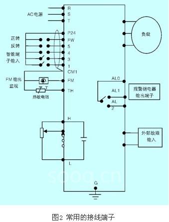 模拟给定公共端子(l),频率给定端子(h),h与l之间能提供+10v直流电。频率指令端子,有电压和电流输入两种,电压一般0~10v,电流4~20ma。模拟监视器,可以监视变频器的输出频率、电压、电流、输入电功率等。内部报警输出端子,可以把变频器内部故障传给与它相连的外部自动化仪器设备,以便实现联动。外部报警输入端子,把外围设备的故障传给变频器,让其做出停机反应,如所带负荷发生故障、自动控制系统发生故障等。外部热敏电阻输入端子,让变频器检测温度,过热时引起跳闸,并停止输出。正反转输入端子,它连接后变频器不受键盘输入运转方向控制,所以常用它来从外部输入运转停止指令。