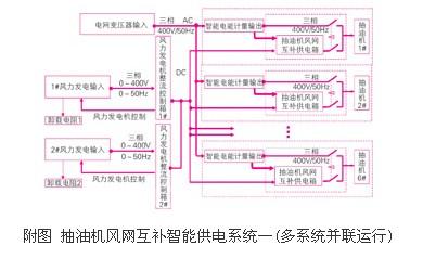 在不需要改变抽油机现场的配电线路的情况下,将风力发电、整流、数字化逆变、能量回馈、变频技术有机的结合,使用风电作为优先供给电源,风电不必上网,直接对24小时运行的设备进行供电,网电作为风电不足时的补充电源,且风电与网电之间采用无缝自动互补。该系统可以“一对多”(一台风力发电机对多台抽油机)或“多对多” (多台风力发电机对多台抽油机)构成一个微型供电网进行就近供电。