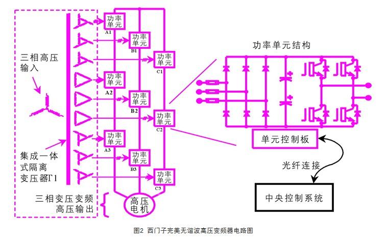 本次设备改造选用了西门子罗宾康完美无谐波变频器,型号为ph-6-6-1250,变频器的电路图如图2所示。输入隔离变压器t1的每一个次级仅供给一个功率单元,每个功率单元通过光纤接收调制信息以产生负载所需要的输出电源频率,每个功率单元可分为整流部分、直流环节和逆变部分。