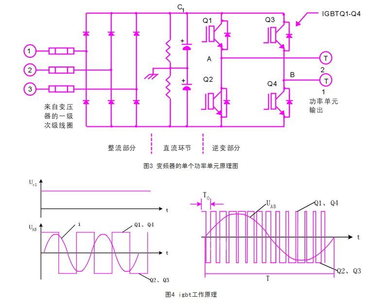 单个功率单元原理图如图3所示,igbt工作原理如图4。当igbt q1、q4同时闭合时,电机上的电压为a点高,b点低;igbt其重要q2、q3同时闭合时,则电机上的电压为a点低b点高。这样和连续不断地交替开合,在电机两端就形成了一交变电压,也就是交流电。西门子完美无谐波变频器通过将多个低压功率单元(690v)的输出叠加起来得到近似于正弦波的中压(6kv)波形。图5为3个功率单元叠加后输出的近似正弦波波形。