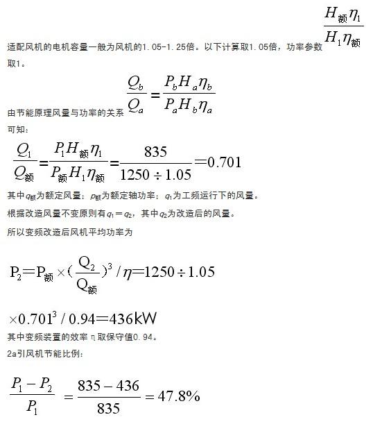 (1)2a#引风机电机功率由原来830kw下降至400kw左右,2b#引风机电机负荷保持不变,扣除变频器室空调等耗电20kw,相对于变频改造前,该电机运行一天可节电:(830-400-20)×24=9840kw·h,每年(按运行330天算)可节约电能:9840×330天= 3247200 kw·h,按平均外购电价约0.72元/kw·h(含税)算,每年可节约电费233.8万元,完全达到了预期的节电效果。