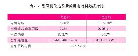 将2a引风机改造前后的用电消耗数据对比,列表如表2所示。