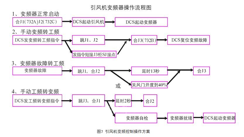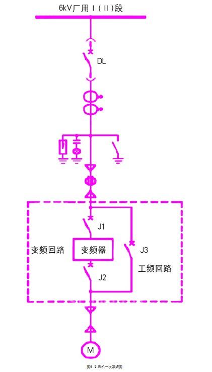 引风机变频改造后的一次系统图如图6所示,dl是厂用变电所732#柜断路器;j1、j2、j3是与变频器配合使用实现工频/变频互相切换的断路器,变频控制方案如下: