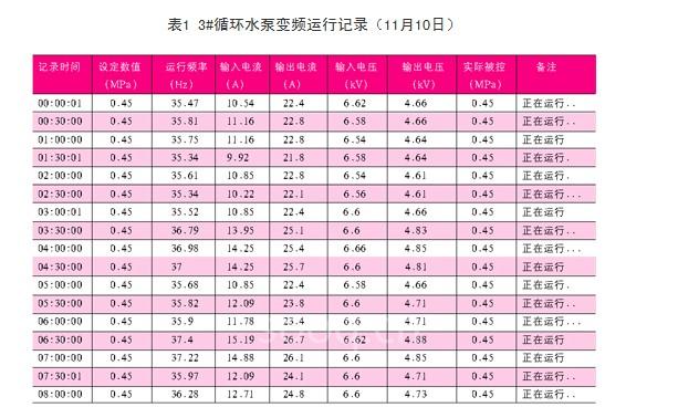 (2)3#循环水泵变频运行记录(11月10日),见表1。