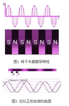 利用两个安装在霍尔传感元件测量磁场时,必须将传感器件安装在磁体的有效距离内(如图1所示)。这样可以得到两个相位相差90°的正弦波,如图2所示。利用这些信号可以控制运动的方向。