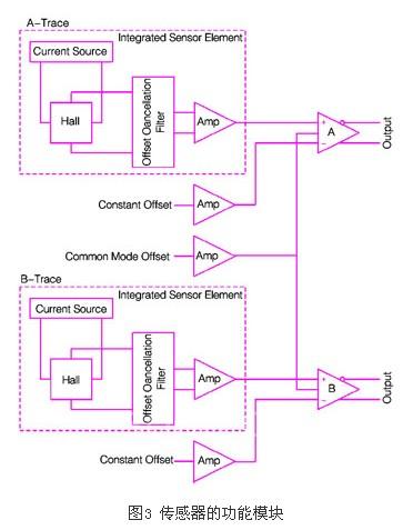 测量采用了一款易于安装的集成传感器件(见图3)。包括电流源在内的霍尔传感器件输出已在封装内部进行了放大。只有通道a和b的两路测量信号需要与变流器输入端进行接口设计,可由两个输出不同的运算放大器(a和b)实现。这样做是为了减少电磁接口。另外,还有两个运放校正传感器的偏移。另一运放提供的恒定电压作为运放a和b的共模输入,该电压的值为传感器电源的一半。完整的电路图见图3。
