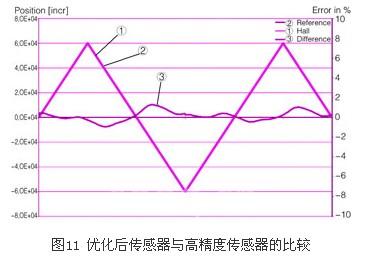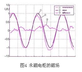传感器的工作性能可以通过测量磁场相对于电枢的位置进行测试,见图4。1#信号为正弦信号(2#)的测量结果,二者的差如图中3#线所示。
