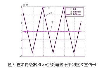 将所得的位置信号与精度为10μm的光电线性传感器所得参考信号进行比较,如图5。2#和1#线表示两个测量信号,3#线为二者误差。在整个测量过程内,位置的绝对误差非常小。