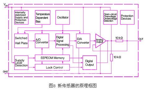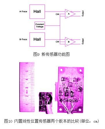 图9是新传感器的功能图。原来的5个运算放大器中有3个可以省去,而性能仍与之前相同。省去的器件使pcb板的尺寸进一步减小,只有原来的40%。图10是两个传感器的比较。